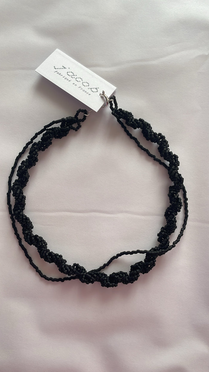 Le collier Essa noir porté par Samya mesure 36 cm .